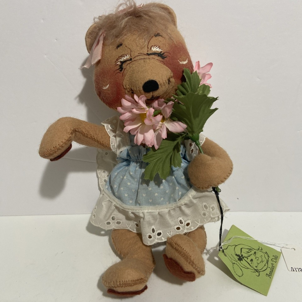 Bambola orso Annalee Mobilitee 1997 braccia pieghevoli gambe vestito blu fiori rosa vintage-