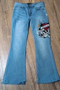 Jeans donna Ed Hardy taglia 26 ricamato gamba larga love kills svasato lento-