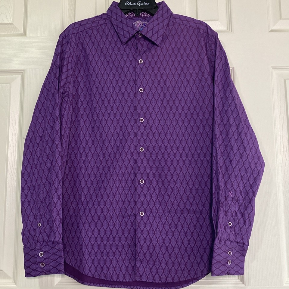 Camicia Robert Graham uomo XL viola geometrica disegno foglia fossile polsino ribaltabile-