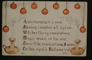 Cartolina Halloween anni '10 F.A Owen Co. mele e candelabri da appendere