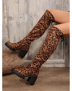 Everyday the Label Leopard Round Toe Block Heel Boots Women Brown