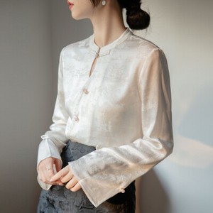 Camicia donna moda blusa top stile cinese jacquard floreale rana bottoni