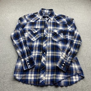 Wrangler Shirt Men Medium Flannel Pearl Snap Long Sleeve Blue Plaid Flap Pockets