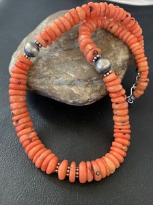 Mens Turquoise & Coral Heishi Navajo Sterling Silver Necklace 22” 14689