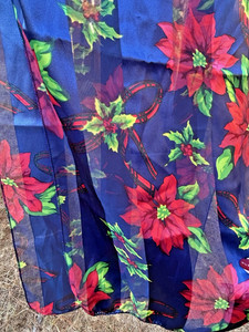Sciarpa festiva rosso verde blu oblunga Poinsettia agrifoglio e fiocchi poli seta trasparente