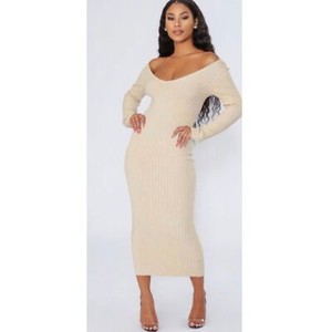Maxi abito aderente a costine manica lunga collezione Herra, beige panna - Taglia S
