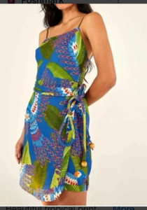 FARM RIO Mini Abito Avvolgente Piccolo Blu Stampa Ara 100% Lino Nuovo con etichette Colorato Tropicale EUR 79,84Ultimo prezzo: EUR 106,46