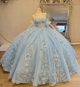 Abiti Quinceanera blu cielo con fiocco compleanno spalle scoperte 3D fiori ballo