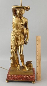 Antica lampada scultura vittoriana oro bronzo dorato ferita amazzonica donna guerriera